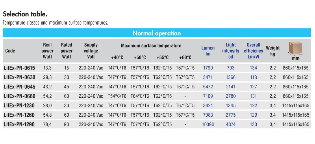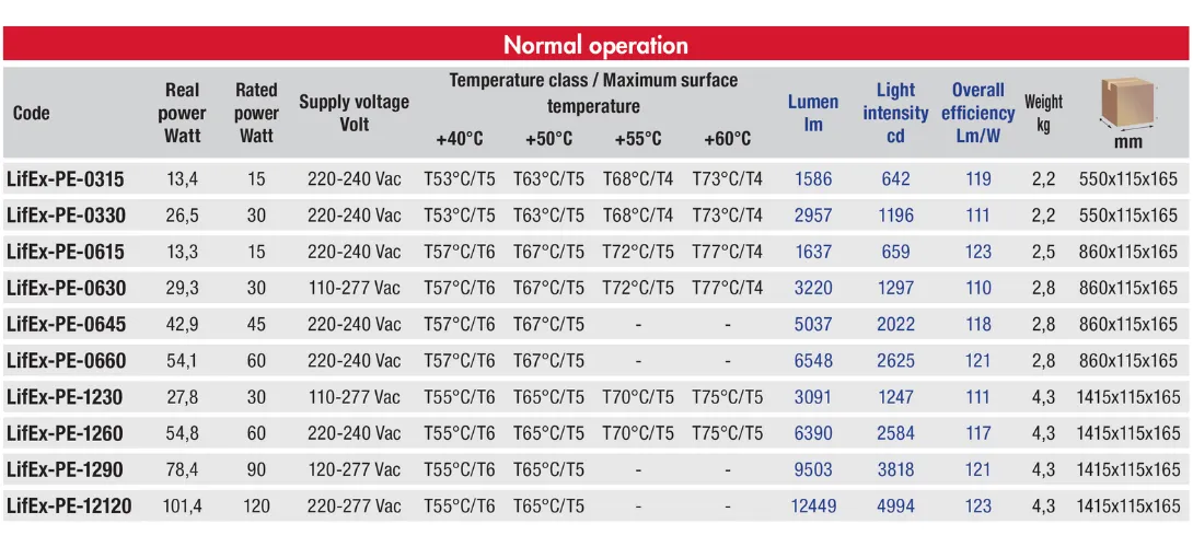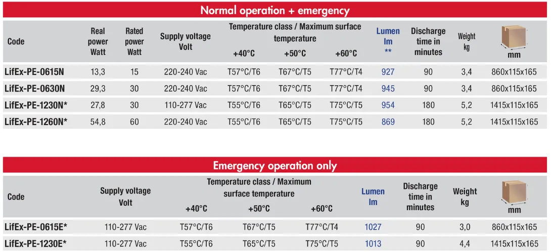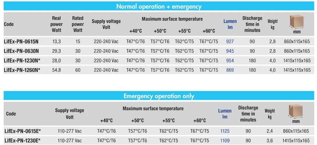Corpurile de iluminat din seria LifEx-P sunt caracterizate de rezistentă la impact (IK09) și UV datorita constructiei carcasei din rășină poliesterică antistatică armată cu fibră de sticlă și policarbonat, cu o latura transparentă pentru dispersarea luminii. Versiunile cu funcționare de urgență pot fi accesorizate cu cutii de baterii pentru a facilita întreținerea și/sau înlocuirea bateriilor, sau cu baterii speciale pentru aplicații cu temperaturi ambientale de până la -60°C.